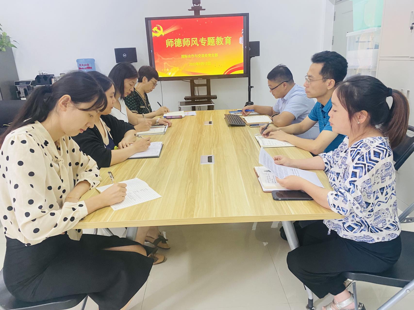 9月13日上午,国际合作与交流处党支部在科学校区办公楼319室组织开展师德师风专题学习活动。会议由支部书记许海龙主持,支部党员、发展对象以及入党积极分子参加学习。